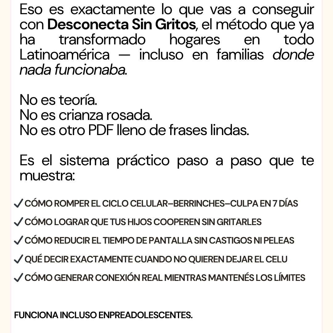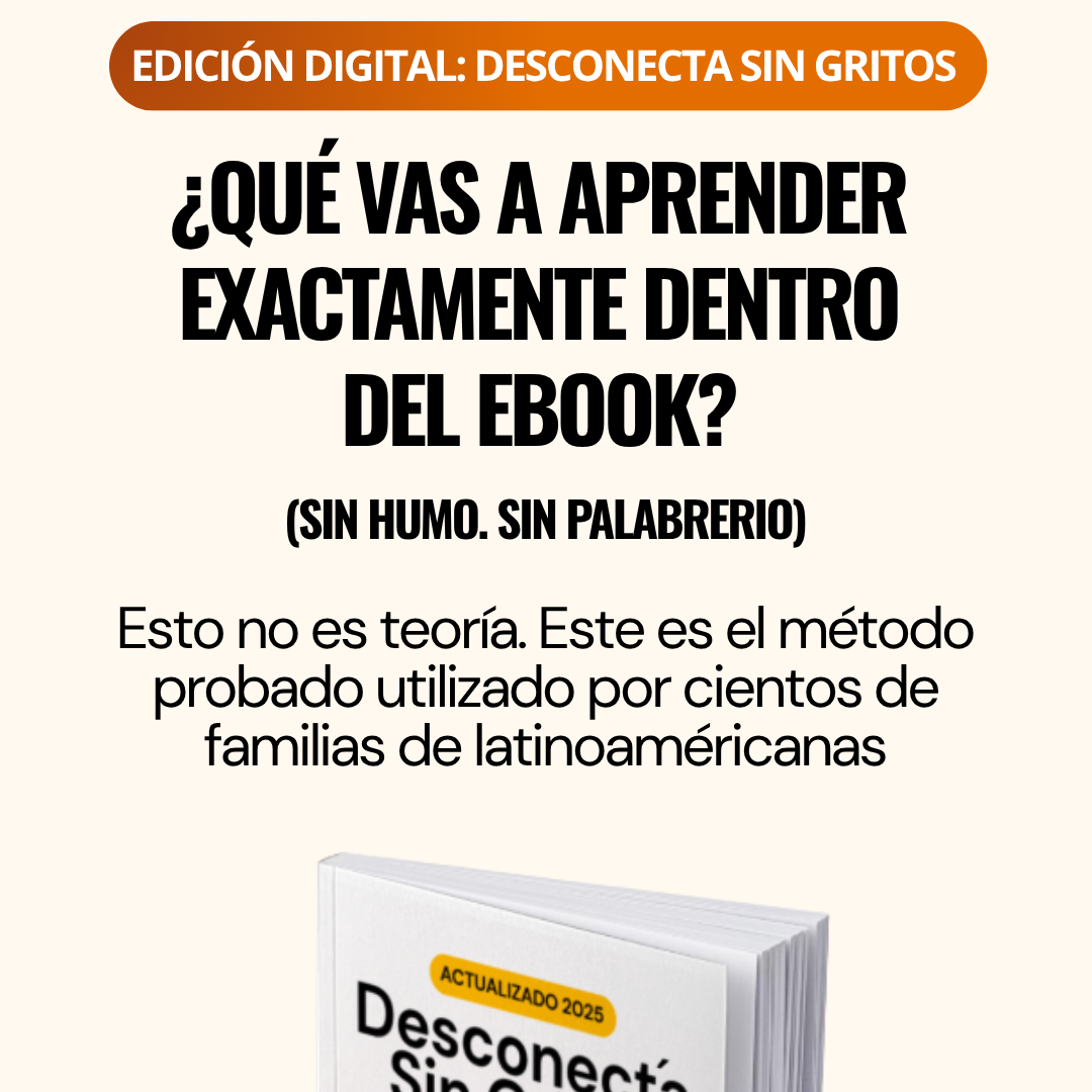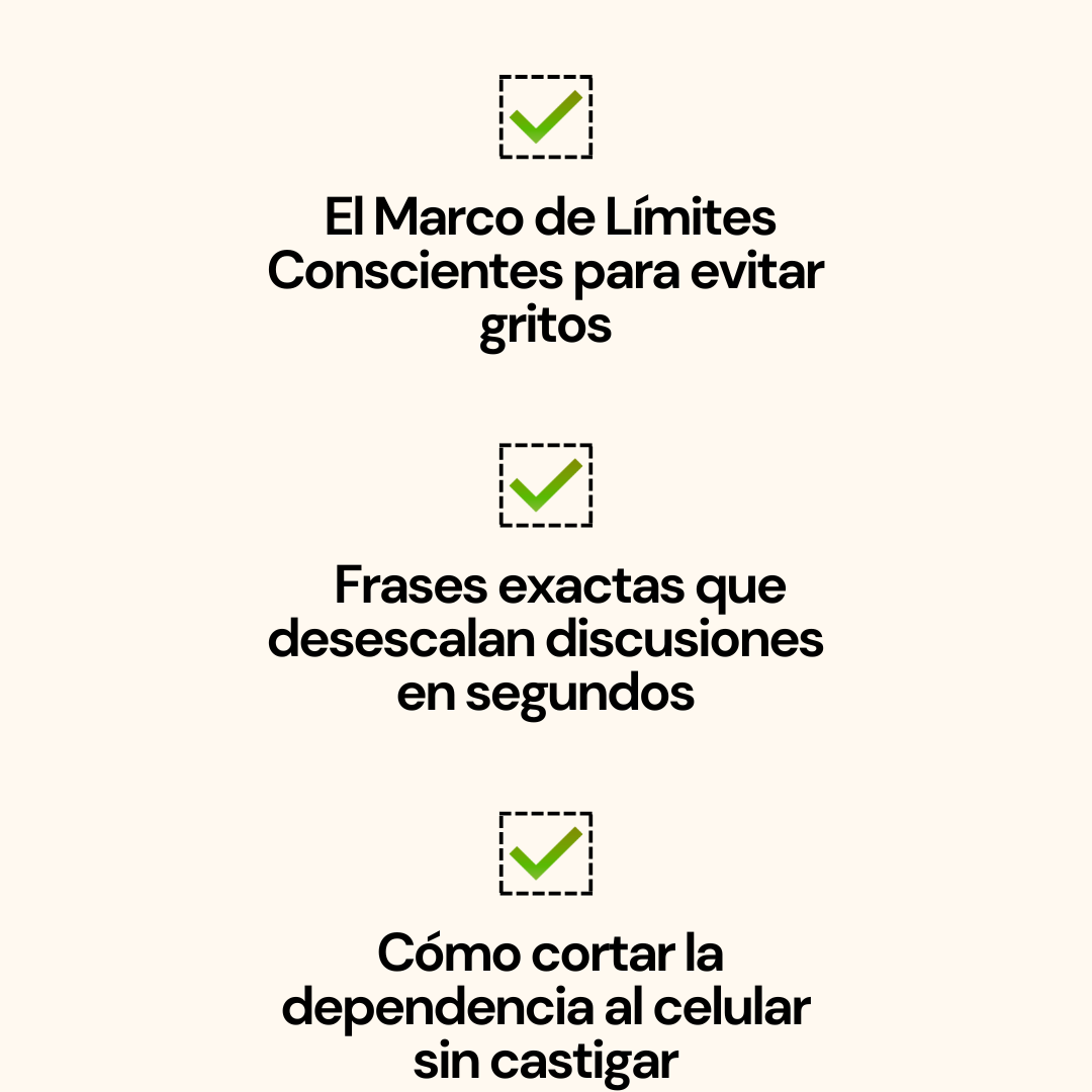 RecibĂs el Ebook digital completo con el mĂ©todo paso a paso para que tu hijo deje el celular sin gritos ni peleas, más los bonos exclusivos incluidos en la oferta actual.