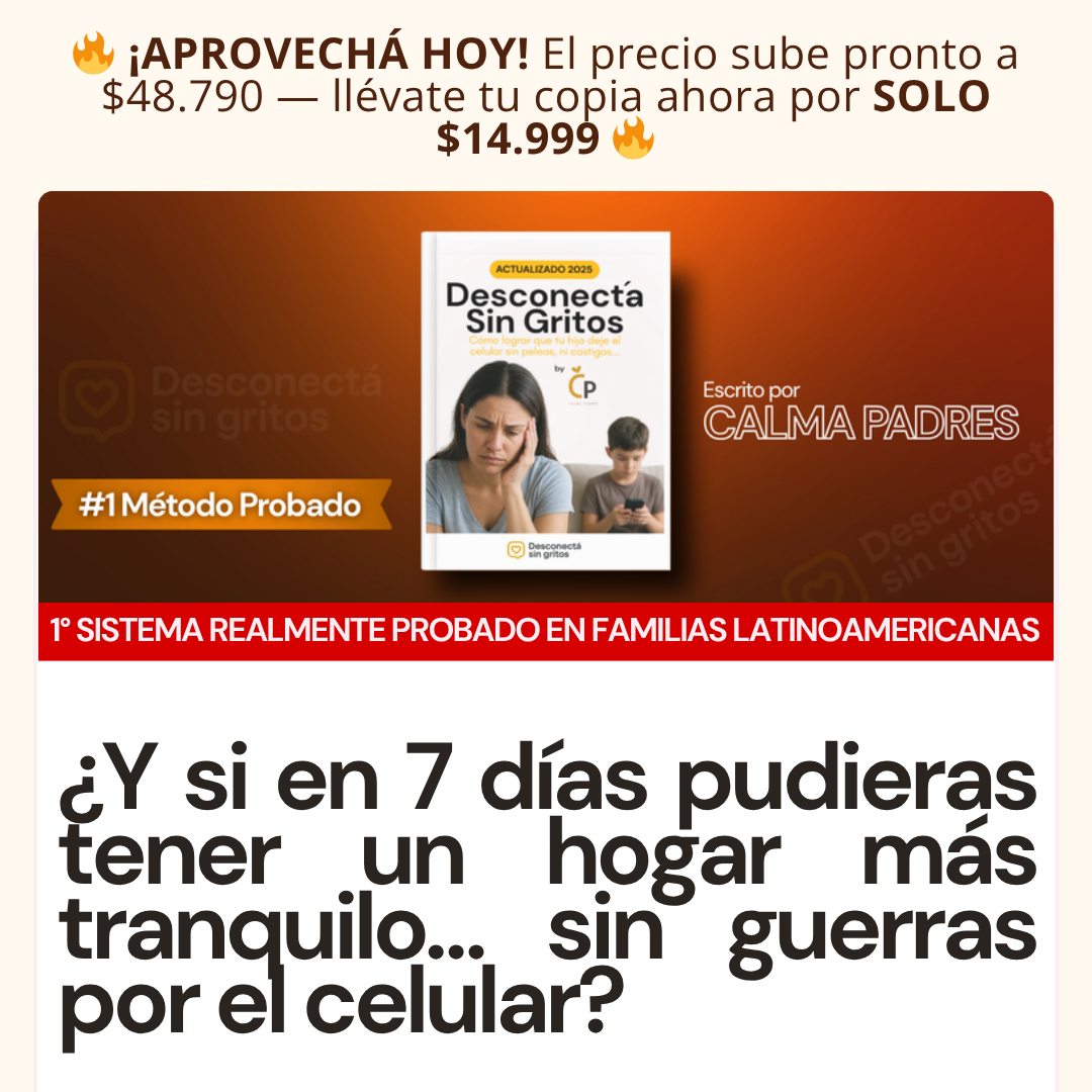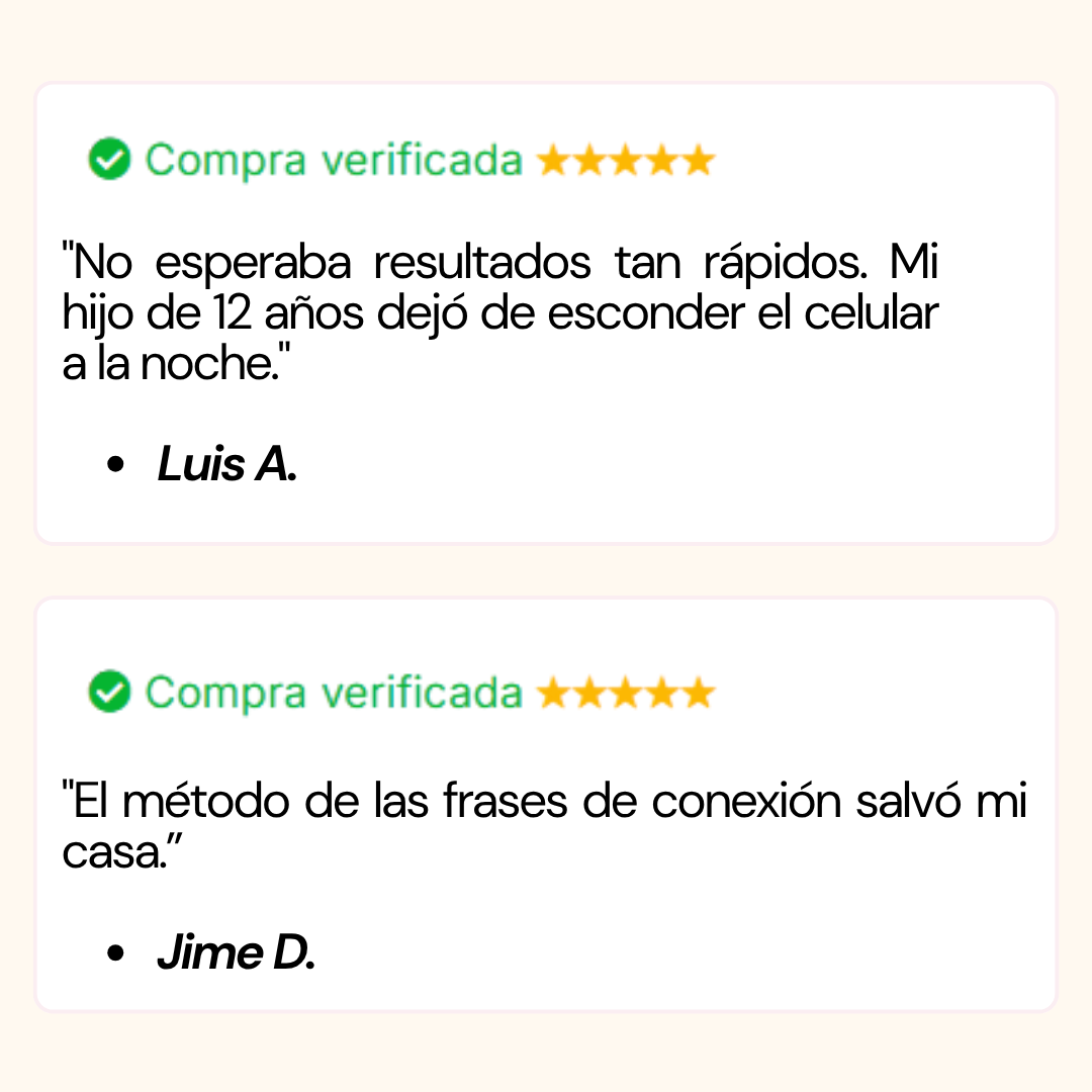 No te preocupes. Este mĂ©todo está comprobado incluso en los casos más difĂciles.Te enseña paso a paso cĂłmo lograr que tu hijo quiera dejar el celular por decisiĂłn propia, sin gritos, sin castigos y sin discusiones.